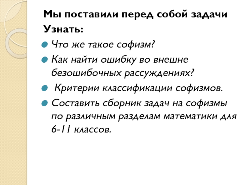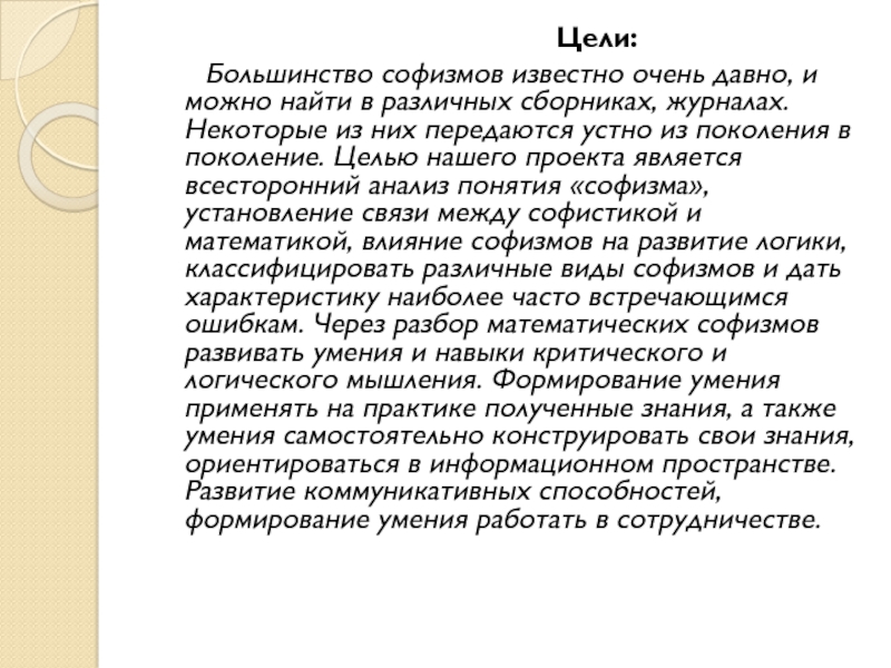 Большинство софизмов известно очень давно, и можно найти в различных сборниках, журналах. Некоторые из них передаются устно из поколения в поколение. Целью нашего проекта является всесторонний анализ понятия «софизма», установление связи между софистикой и математикой, влияние софизмов на развитие логики, классифицировать различные виды софизмов и дать характеристику наиболее часто встречающимся ошибкам. Через разбор математических софизмов развивать умения и навыки критического и логического мышления. Формирование умения применять на практике полученные знания, а также умения самостоятельно конструировать свои знания, ориентироваться в информационном пространстве. Развитие коммуникативных способностей, формирование умения работать в сотрудничестве.