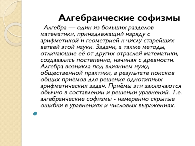 Алгебра — один из больших разделов математики, принадлежащий наряду с арифметикой и геометрией к числу старейших ветвей этой науки. Задачи, а также методы, отличающие её от других отраслей математики, создавались постепенно, начиная с древности. Алгебра возникла под влиянием нужд общественной практики, в результате поисков общих приёмов для решения однотипных арифметических задач. Приёмы эти заключаются обычно в составлении и решении уравнений. Т.е. алгебраические софизмы - намеренно скрытые ошибки в уравнениях и числовых выражениях.