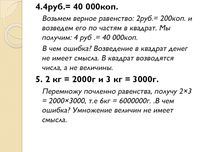 Перемножу почленно равенства, получу 2×3 = 2000×3000, т.е 6кг = 6000000г. .В чем ошибка? Умножение величин не имеет смысла.