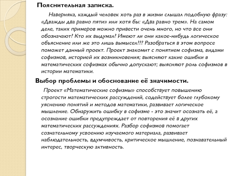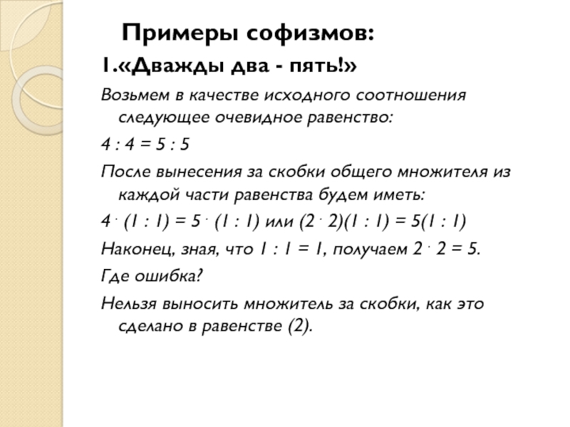 хоть раз в жизни слышал подобную фразу: «Дважды два равно пяти» или хотя бы: «Два равно трем». На самом деле, таких примеров можно привести очень много, но что все они обозначают? Кто их выдумал? Имеют ли они какое-нибудь логическое объяснение или же это лишь вымысел??? Разобраться в этом вопросе поможет данный проект. Проект знакомит с понятием софизма, видами софизмов, историей их возникновения; выясняют какие ошибки в математических софизмах обычно допускают; выясняют роль софизмов в истории математики.