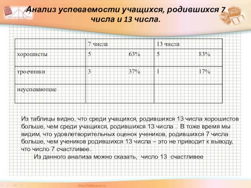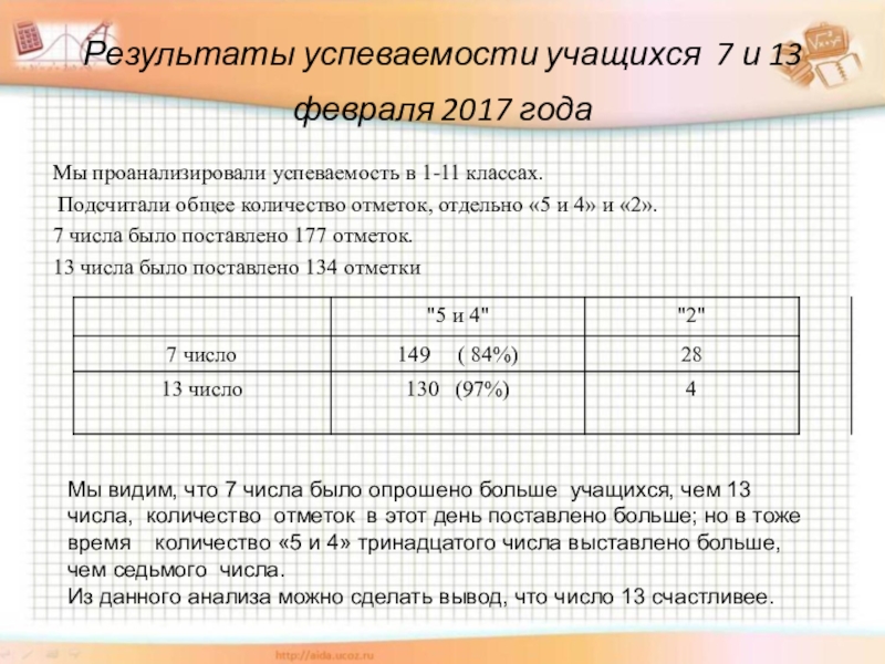 Мы видим, что 7 числа было опрошено больше учащихся, чем 13 числа, количество отметок в этот день поставлено больше; но в тоже время количество «5 и 4» тринадцатого числа выставлено больше, чем седьмого числа.