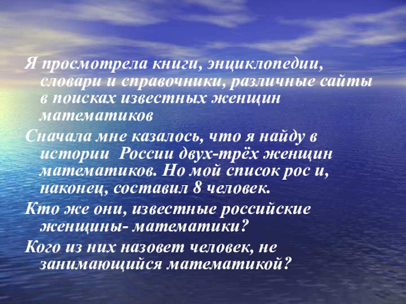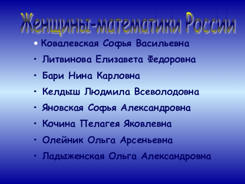 Сначала мне казалось, что я найду в истории России двух-трёх женщин математиков. Но мой список рос и, наконец, составил 8 человек.