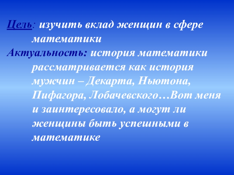 история мужчин – Декарта, Ньютона, Пифагора, Лобачевского…Вот меня и заинтересовало, а могут ли женщины быть успешными в математике