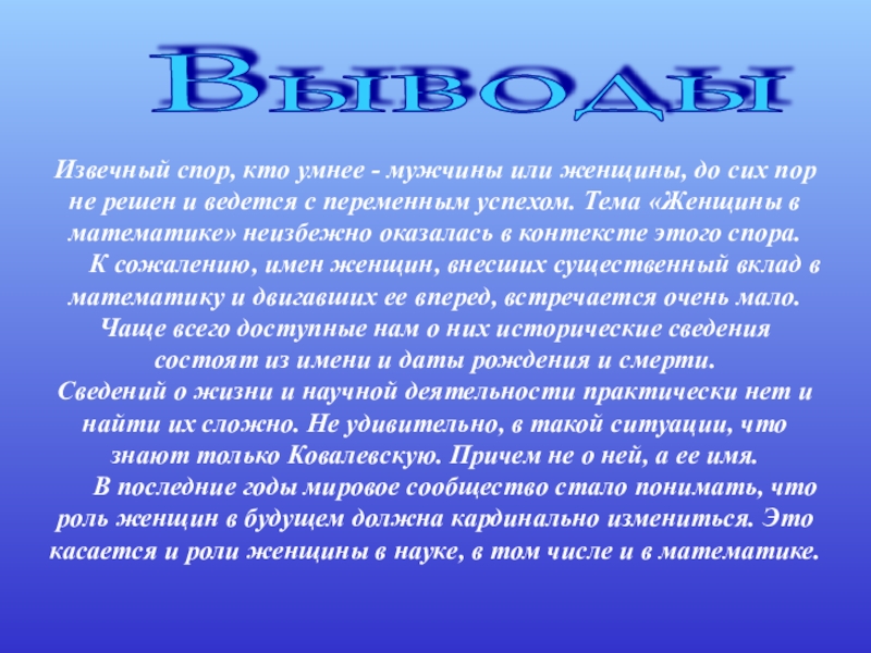 Слайд 5Неспособность женщин к математике — ничем не подтверждающаяся гипотеза.
