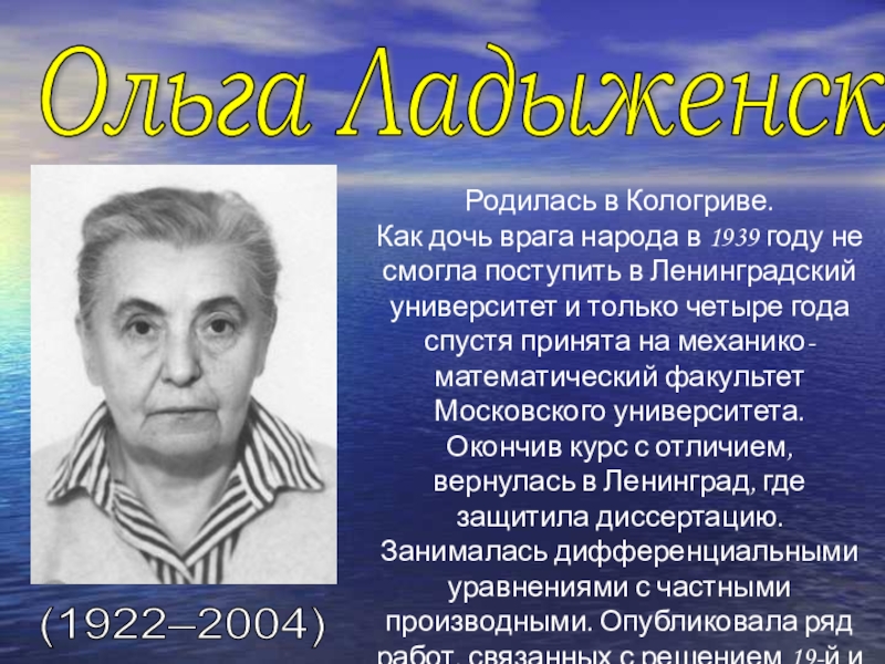году не смогла поступить в Ленинградский университет и только четыре года спустя принята на механико-математический факультет Московского университета. Окончив курс с отличием, вернулась в Ленинград, где защитила диссертацию. Занималась дифференциальными уравнениями с частными производными. Опубликовала ряд работ, связанных с решением 19-й и 20-й проблем Гильберта.