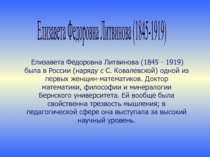 Слайд 13Елизавета Федоровна Литвинова (1845-1919)