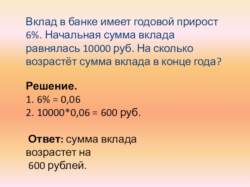 Вклад в банке имеет годовой прирост 6%. Начальная сумма вклада равнялась 10000 руб. На сколько возрастёт сумма вклада в конце года?