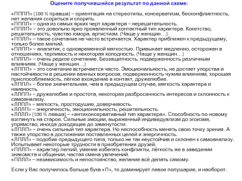 Если у Вас получилось больше букв «П», то доминирует левое полушарие, и наоборот.