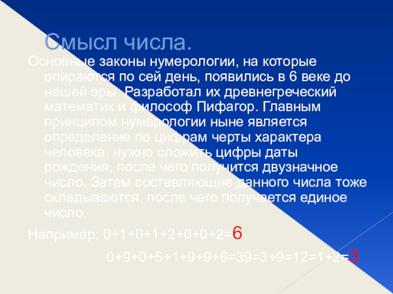 в 6 веке до нашей эры. Разработал их древнегреческий математик и философ Пифагор. Главным принципом нумерологии ныне является определение по цифрам черты характера человека, нужно сложить цифры даты рождения, после чего получится двузначное число. Затем составляющие данного числа тоже складываются, после чего получается единое число.
