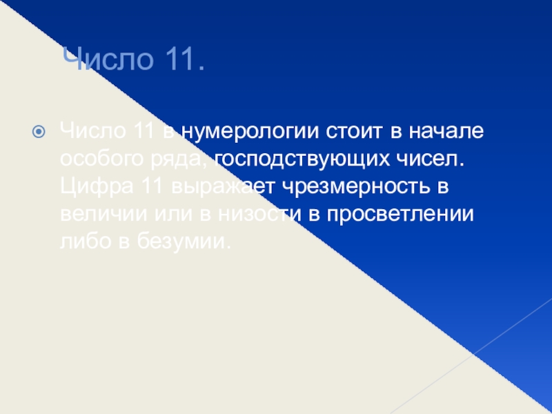 господствующих чисел. Цифра 11 выражает чрезмерность в величии или в низости в просветлении либо в безумии.