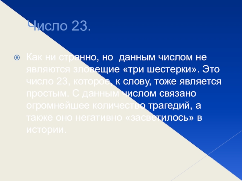 шестерки». Это число 23, которое, к слову, тоже является простым. С данным числом связано огромнейшее количество трагедий, а также оно негативно «засветилось» в истории.