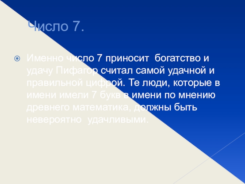 удачной и правильной цифрой. Те люди, которые в имени имели 7 букв в имени по мнению древнего математика, должны быть невероятно удачливыми.