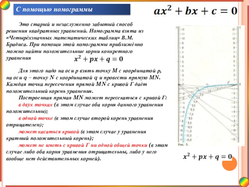 Для этого надо на оси р взять точку M с координатой р, на оси q – точку N с координатой q и провести прямую MN. Каждая точка пересечения прямой MN с кривой Г даѐт положительный корень уравнения.