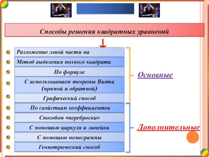 Основным в решении квадратных уравнений является правильно выбрать рациональный способ решения и применить алгоритм решения
