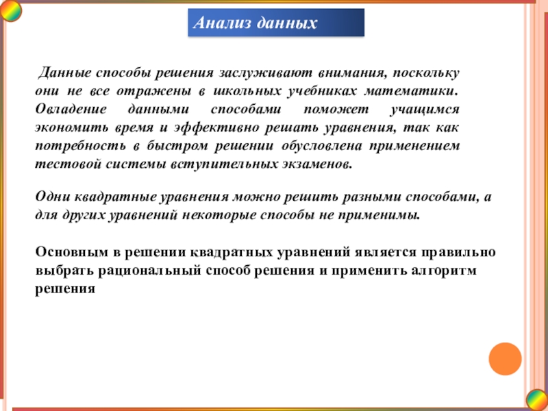Данные способы решения заслуживают внимания, поскольку они не все отражены в школьных учебниках математики. Овладение данными способами поможет учащимся экономить время и эффективно решать уравнения, так как потребность в быстром решении обусловлена применением тестовой системы вступительных экзаменов.