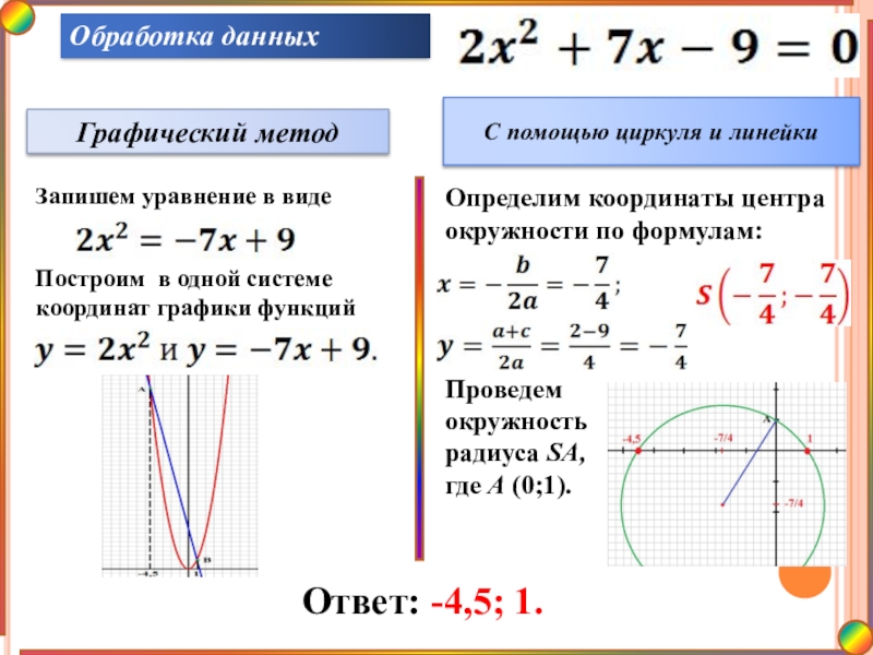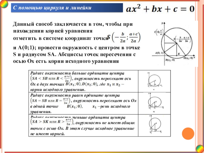 и А(0;1); провести окружность с центром в точке S и радиусом SA. Абсциссы точек пересечения с осью Ох есть корни исходного уравнения