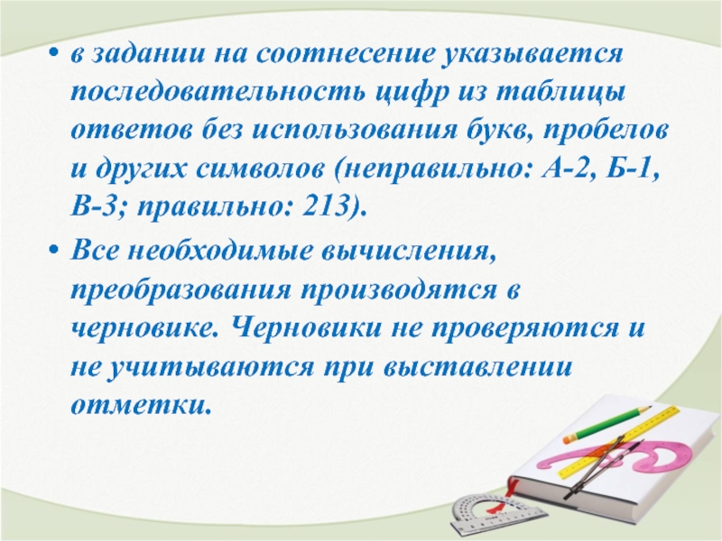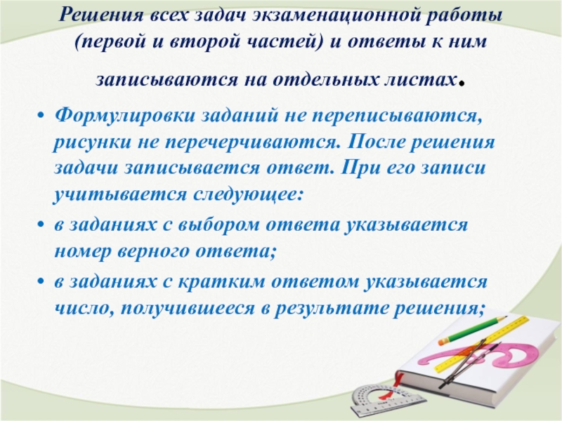 Формулировки заданий не переписываются, рисунки не перечерчиваются. После решения задачи записывается ответ. При его записи учитывается следующее:
