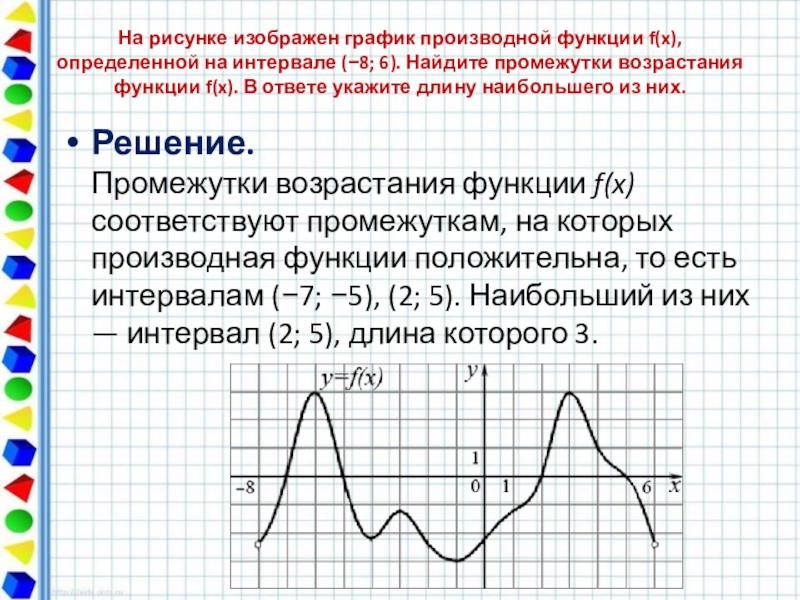 Промежутки возрастания функции f(x) соответствуют промежуткам, на которых производная функции положительна, то есть интервалам (−7; −5), (2; 5). Наибольший из них — интервал (2; 5), длина которого 3.