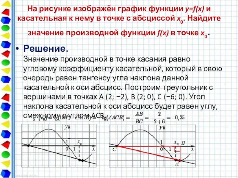 Значение производной в точке касания равно угловому коэффициенту касательной, который в свою очередь равен тангенсу угла наклона данной касательной к оси абсцисс. Построим треугольник с вершинами в точках A (2; −2), B (2; 0), C (−6; 0). Угол наклона касательной к оси абсцисс будет равен углу, смежному с углом ACB