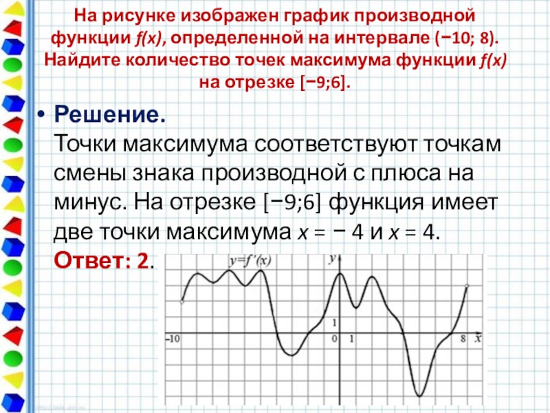 Точки максимума соответствуют точкам смены знака производной с положительного на отрицательный. На отрезке [−6; 9] функция имеет одну точку максимума x = 7.