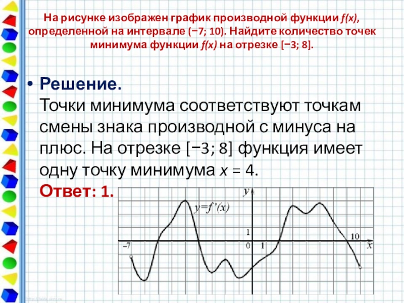 Точки минимума соответствуют точкам смены знака производной с минуса на плюс. На отрезке [−3; 8] функция имеет одну точку минимума x = 4.