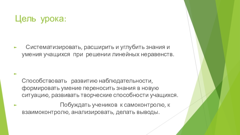 Систематизировать, расширить и углубить знания и умения учащихся при решении линейных неравенств.