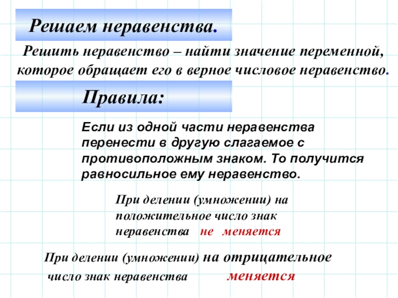 Если из одной части неравенства перенести в другую слагаемое с противоположным знаком. То получится равносильное ему неравенство.