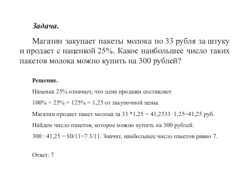 Магазин закупает пакеты молока по 33 рубля за штуку и продает с наценкой 25%. Какое наибольшее число
