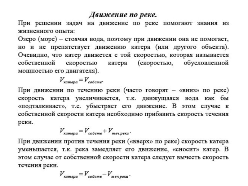 знать различие скоростей объекта в стоячей воде, против течения и по течению реки;