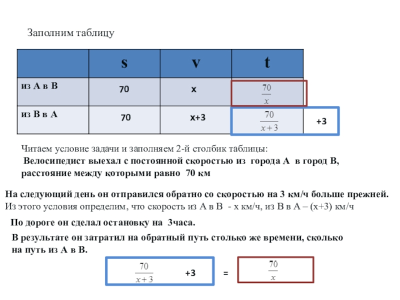 Из этого условия определим, что скорость из А в B - х км/ч, из B в A – (х+3) км/ч