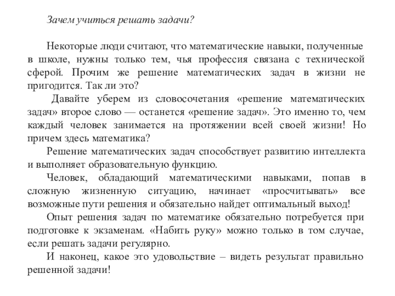 Давайте уберем из словосочетания «решение математических задач» второе слово — останется «решение задач». Это именно то, чем каждый человек занимается на протяжении всей своей жизни! Но причем здесь математика?
