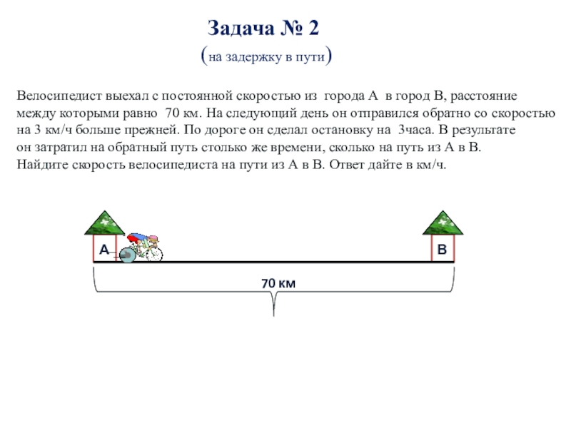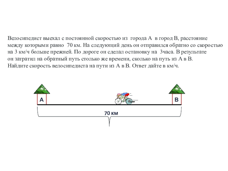 которыми равно 70 км. На следующий день он отправился обратно со скоростью на 3 км/ч больше прежней. По дороге он сделал остановку на 3часа. В результате он затратил на обратный путь столько же времени, сколько на путь из А в В.