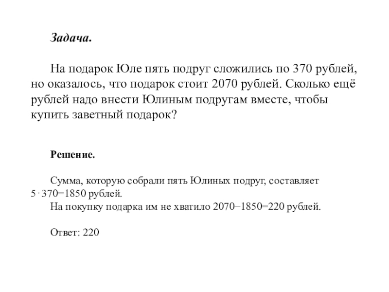 что подарок стоит 2070 рублей. Сколько ещё рублей надо внести Юлиным подругам вместе, чтобы купить заветный подарок?