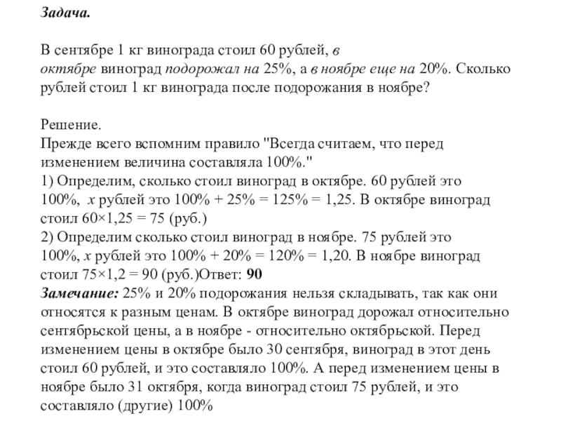 Замечание: 25% и 20% подорожания нельзя складывать, так как они относятся к разным ценам. В октябре виноград дорожал относительно сентябрьской цены, а в ноябре - относительно октябрьской. Перед изменением цены в октябре было 30 сентября, виноград в этот день стоил 60 рублей, и это составляло 100%. А перед изменением цены в ноябре было 31 октября, когда виноград стоил 75 рублей, и это составляло (другие) 100%