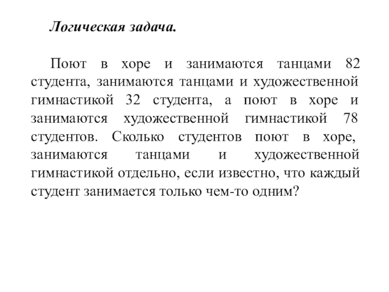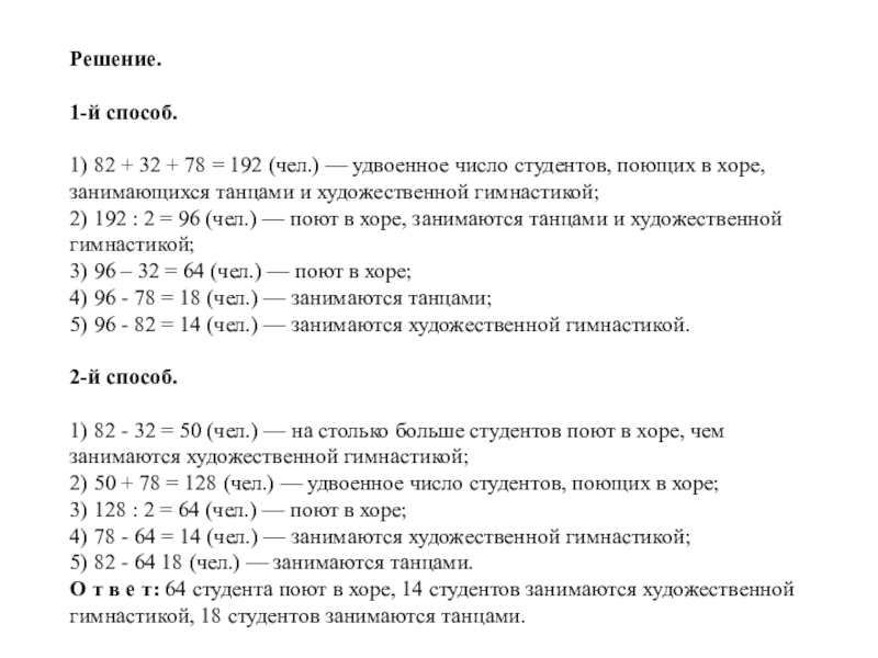 О т в е т: 64 студента поют в хоре, 14 студентов занимаются художественной гимнастикой, 18 студентов занимаются танцами.