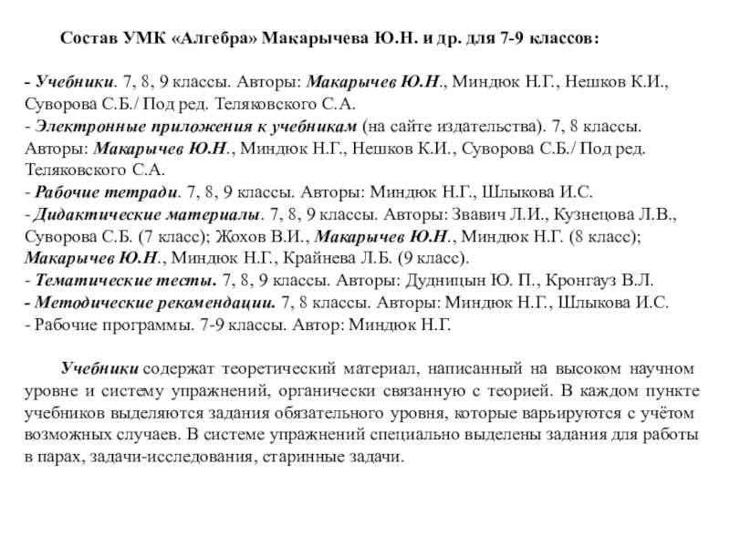 Слайд 4Состав УМК «Алгебра» Макарычева Ю.Н. и др. для 7-9 классов: