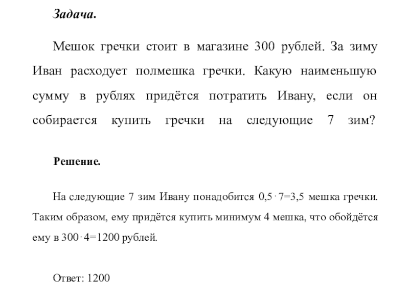 На следующие 7 зим Ивану понадобится 0,5⋅7=3,5 мешка гречки. Таким образом, ему придётся купить минимум 4 мешка, что обойдётся ему в 300⋅4=1200 рублей.
