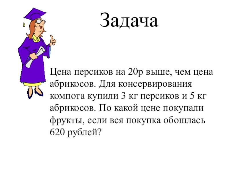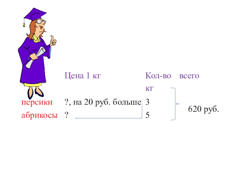 компота купили 3 кг персиков и 5 кг абрикосов. По какой цене покупали фрукты, если вся покупка обошлась 620 рублей?