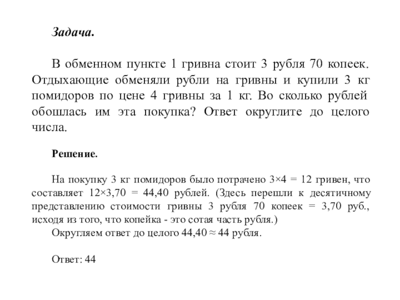 На покупку 3 кг помидоров было потрачено 3×4 = 12 гривен, что составляет 12×3,70 = 44,40 рублей. (Здесь перешли к десятичному представлению стоимости гривны 3 рубля 70 копеек = 3,70 руб., исходя из того, что копейка - это сотая часть рубля.)