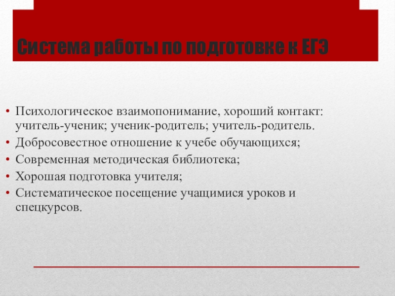 Система работы по подготовке к ЕГЭПсихологическое взаимопонимание, хороший контакт: учитель-ученик; ученик-родитель; учитель-родитель.Добросовестное отношение к учебе обучающихся;Современная методическая