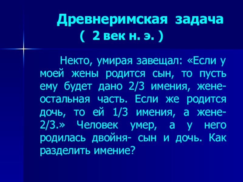 Некто, умирая завещал: «Если у моей жены родится сын, то пусть ему будет дано 2/3 имения, жене- остальная часть. Если же родится дочь, то ей 1/3 имения, а жене- 2/3.» Человек умер, а у него родилась двойня- сын и дочь. Как разделить имение?