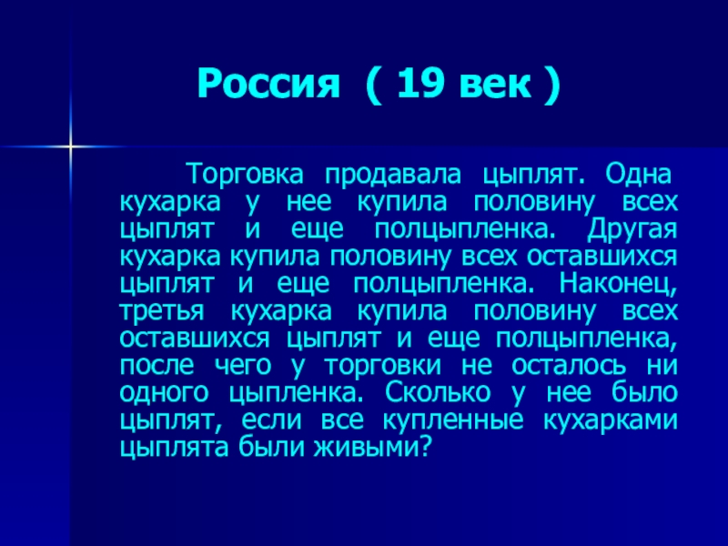 Торговка продавала цыплят. Одна кухарка у нее купила половину всех цыплят и еще полцыпленка. Другая кухарка купила половину всех оставшихся цыплят и еще полцыпленка. Наконец, третья кухарка купила половину всех оставшихся цыплят и еще полцыпленка, после чего у торговки не осталось ни одного цыпленка. Сколько у нее было цыплят, если все купленные кухарками цыплята были живыми?