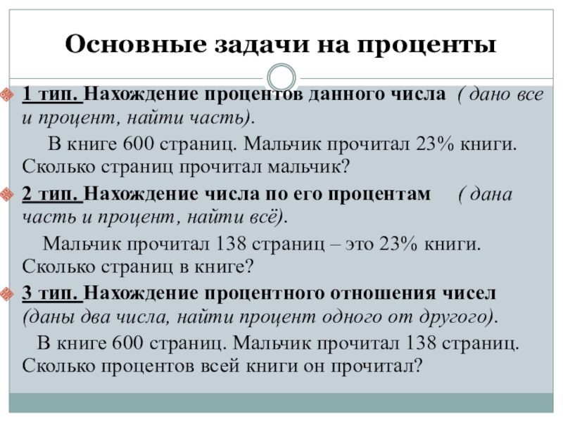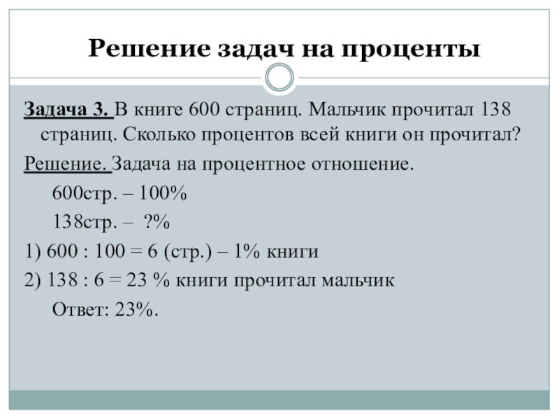 Решение задач на процентыЗадача 3. В книге 600 страниц. Мальчик прочитал 138 страниц. Сколько процентов всей книги