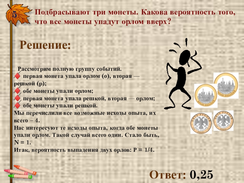 5.Подбрасывают три монеты. Какова вероятность того, что все монеты упадут орлом вверх? Ответ: 0,25Решение:Рассмотрим полную группу событий.