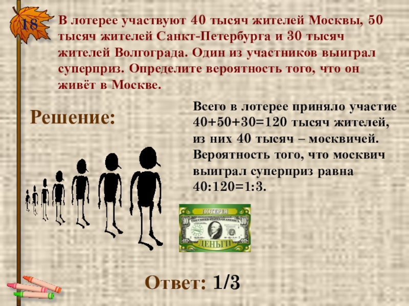 18.В лотерее участвуют 40 тысяч жителей Москвы, 50 тысяч жителей Санкт-Петербурга и 30 тысяч жителей Волгограда. Один