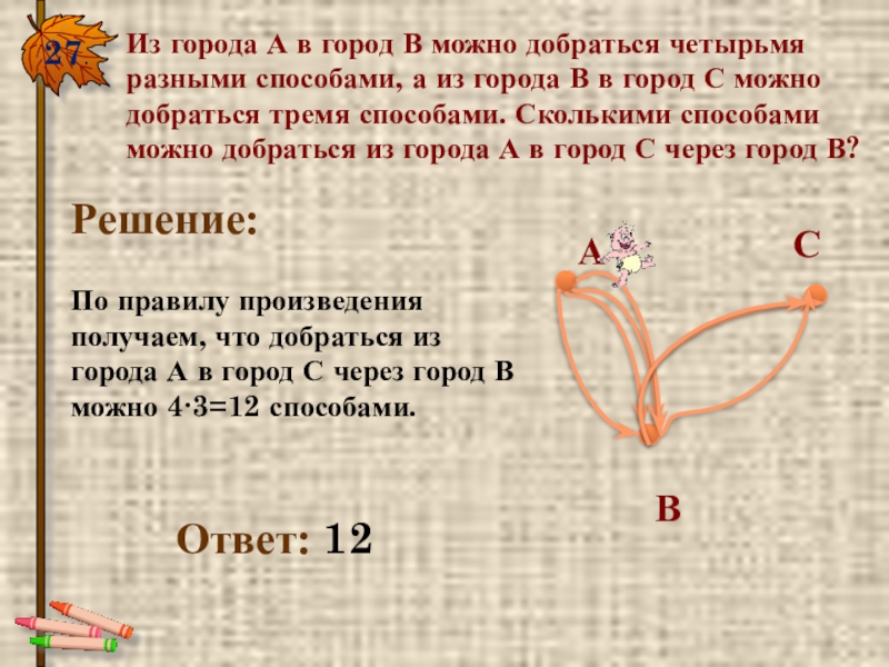По правилу произведения получаем, что добраться из города А в город С через город В можно 4∙3=12 способами.