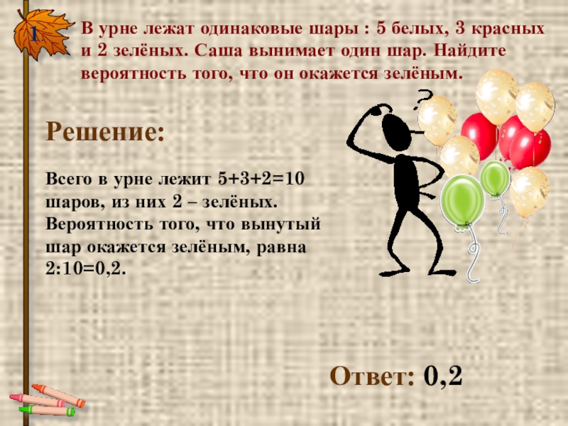 1.В урне лежат одинаковые шары : 5 белых, 3 красных и 2 зелёных. Саша вынимает один шар. Найдите вероятность того, что он окажется зелёным.Ответ: 0,2Решение:Всего в урне лежит 5+3+2=10 шаров, из них 2 – зелёных. Вероятность