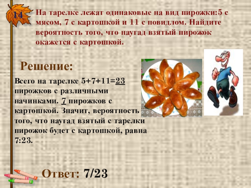 14.На тарелке лежат одинаковые на вид пирожки:5 с мясом, 7 с картошкой и 11 с повидлом. Найдите
