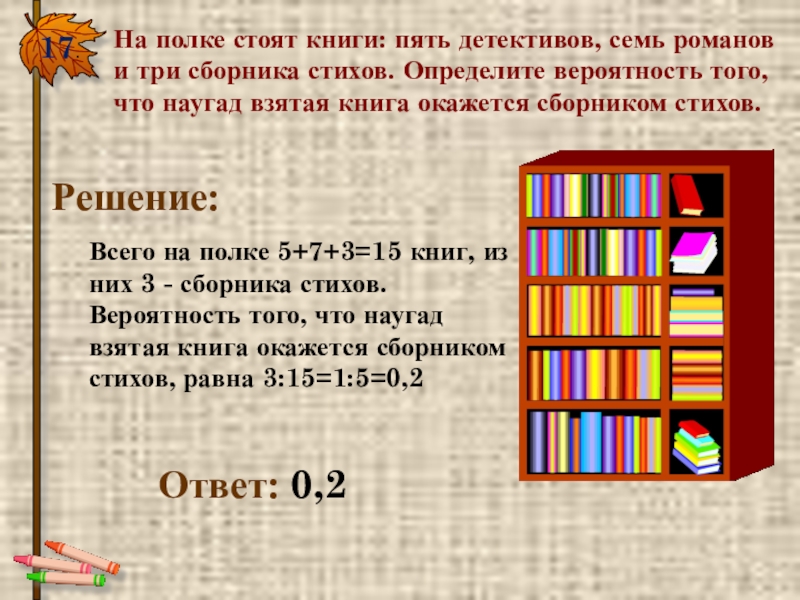 17.На полке стоят книги: пять детективов, семь романов и три сборника стихов. Определите вероятность того, что наугад