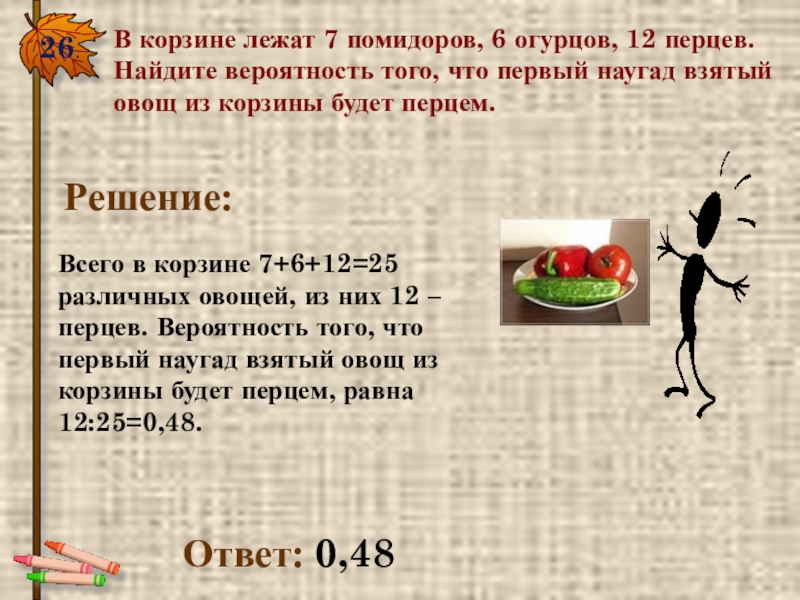 26.В корзине лежат 7 помидоров, 6 огурцов, 12 перцев. Найдите вероятность того, что первый наугад взятый овощ